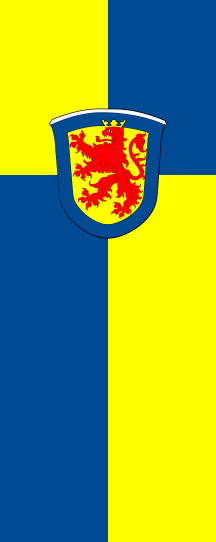 The banner is off-centred quartered of yellow and blue. The coat of arms is superimposing the common point of all quarters.
