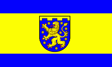 The ratio is 3:5. It is a horizontal 3-stripes flag: blue over yellow over blue with ratio 1:3:1, the coat of arms is in the centre of the yellow stripe. Please note that local Hauptsatzung doesn't mention any flag.
