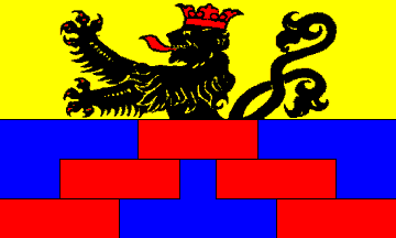 It is a blue-yellow bicolour with centred arms. That is, what the source says and it is confirmed by Klaus Günther and probably is the approved version (see left image above), but there is also a flag in use with a white fimbriation between the blue and the yellow stripe (see right image above).