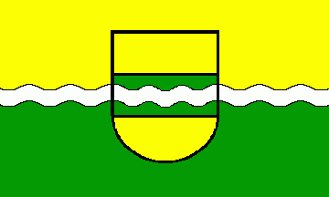 It is a yellow over green bicolour, both colours divided by a white, fessy, wavy line. In the centre of the flag the coat of arms is superimposed in that way, that the wavy lines on cloth and coat