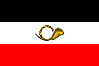 The Flag of the State Post Service (Reichs-Postamt) is like the Foreign Office state flag, but instead of the eagle a golden post horn crowned with the Imperial crown in gold. Ships delivering mail flew this flag at the top mast and as jack, and the merchant flag at the stern. Adopted 1893 and abandoned by 1921. Sources: Illustrated in Crampton 1990 p. 42 (which is a copy of Meyers Konversationslexikon 1912, vol. 4, facing p. 799) and National Geographic 1917 p. 367, no. 1011).