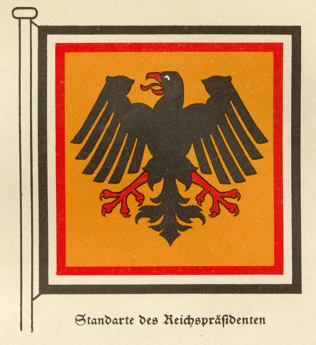 "Obwohl angeblich kein Bedarf für eine Änderung der Standarte des Reichspräsidenten gesehen wurde, ist diese doch mit der "Zweiten Verordnung über die vorläufige Regelung der Flaggenführung" vom 22. April 1933 dergestalt vorgenommen worden, dass der rote Rand durch einen schwarz-weiß-roten ersetzt wurde. Die Streifen sind gleich breit. Schwarz liegt außen. Die Breite des Randes verhält sich zur Flaggenhöhe wie 1 : 10. Gleichzeitig erhielt der schwarze Adler eine leicht veränderte Gestaltung (Abb. 352}.