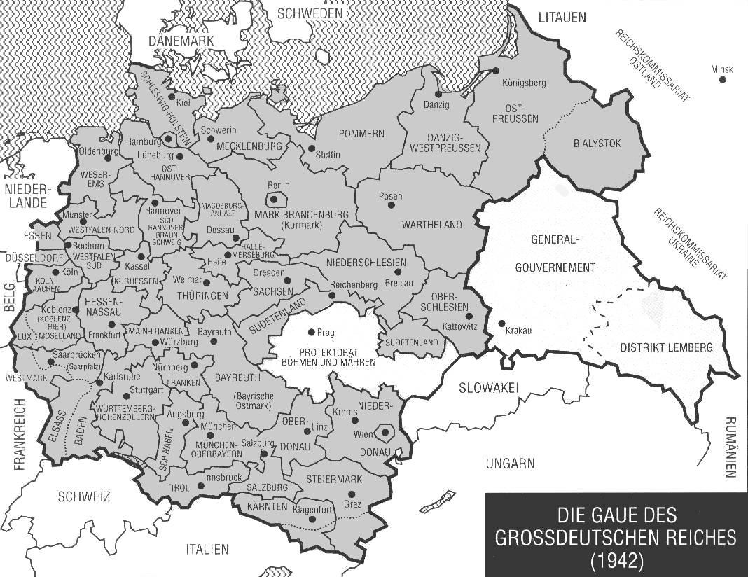 Now it is getting complicated. My source is Manfred Scheuch, Atlas zur Zeitgeschichte - Europa im 20. Jahrhundert. The Gesetz über den Neuaufbau des Reiches (law about the new structure of the Reich) was adopted on 30th January 1934. The parliaments of the Länder were eliminated. The territorial and justice rights of the Länder were given to the Reich. The Ministerpräsidenten (prime ministers) of the Länder were replaced by Reichsstatthalter (governors) which were nominated directly by the Führer. Only Prussia kept his Ministerpräsident, Hermann Göring. In 1938 there were 38 Gaue in the 14 Länder of Germany. When Austria was annexed, the so-called Ostmark got its own Reichsstatthalter. Later each of the seven Gaue of Ostmark and Sudetenland got its own Reichsstatthalter and were changed into Reichsgaue. During the war other Reichsgaue were created: Danzig-Westpreußen and Wartheland in the East, Baden-Elsaß, Westmark (with Palatinate) and Moselland in the West. During the war the simple Gauleiter got more and more rights, so the difference with the Reichstatthalter disappeared. Even the borders of the Gaue did not follow the borders of the Länder, as can be seen in this scan from the above source.