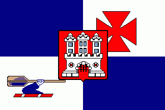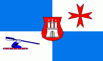 The white quartes are charged as follows: a Hanseatic cross, i.e. a red cross patty, (2nd quarter) and an arm holding an oar and issuant from a bulge of red with white stripes.