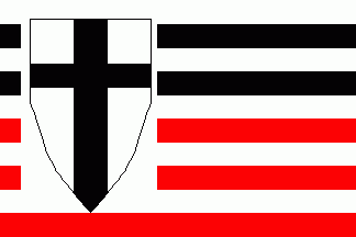 The flag has ten horizontal stripes, the upper half alternating black and white starting with a white one, the lower half alternating red and white starting with a red one. In the flag is a black-edged