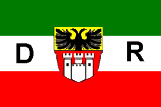 It is a green over white over red horizontal tricolour with the coat of arms of the city in its centre. Within the white stripe are black capital letters "D" (hoist) and "R" (fly).