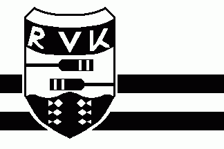 The flag is white parted abased by two horizontal black stripes. Over all shifted to hoist is a white shield with black edges and black base wavy, displaying six white fish respectant ordered 3:3 in pales, above two black oars in fess ordered per pale with different directions, above on a black fess embowed a white inscription "RVK".