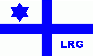 The white flag was parted by a blue centred cross. On upper hoist quarter was a blue 6-point star. On lower fly quarter was a blue inscription "LRG".