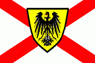 The flag was white parted by a red saltire. Over all was a yellow shield displaying a black eagle.