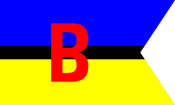 The cloth is blue over yellow witth a thin horizontal black stripe along the middle and over all a large red serifless capital "B".