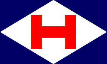 The company was located in Moorrege (Pinneberg county). It is a blue flag with a red lozenge, containing a white capital "H" in its centre. The lozenge is touching the edges.