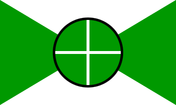 It is a 3:5 ratio white and green flag divided per saltire with a green disc over all with a thin white cross throughout and black egding.