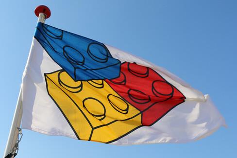 This flag design has been available as one of the building blocks itself, to be used in lego buildings, since at least 1973 and as a decal to be glued on blank flags.