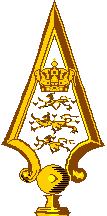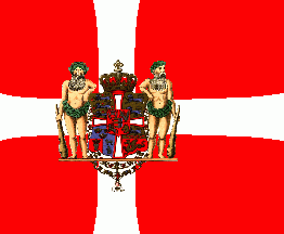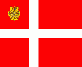 In Amalienborg Castle,the residence of the royal family in København, there exist two so called "Gala Ensigns" (Danish: Galla Faner). They are not assigned to a special branch of the service. The pattern of both is the same, but they have different finials. The ensign is a usual Danish military flag, i.e. red off-centred parted by a white cross patty. Its centre is surmounted by the Greater State Arms model 1819, but directly upon cross and not in a white rectangle.