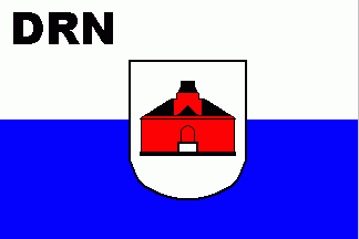 A newer flag shows the stylised local castle from the town arms in red and black and has a black inscriprtion "DRN" in canton