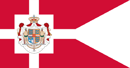 Other members of the royal family have a similar flag with their personal coat of arms; ceremonial not required). White square field with the appropriate coat of arms to which is attached a trapezoidal form of the national flag (actually, the crossbar at fly converges too). As far as I understand the Album des Pavillons (2000) footnotes, this flag is used by the Queen and other members of the royal house who are entitled to the flag instead of the "normal" split-flag in less ceremonial occasions - i.e. when they want to indicate that they are present on a ship, but that they do not wish that other ships would pay the respect with gun saluting and similar. I would suppose that these flags would therefore be used much more often nowadays then the "formal" ones. The royal flags would be made of the "civilian" red shade normally, however, we may assume that the naval ships that are equipped with the royal flags would have them in the naval dark red just as any other flags in their lockers.