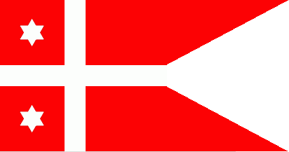It is a split flag with white six-pointed stars, two in the first quarter and one in the third. The basic colour is Dannebrogsrød.