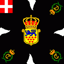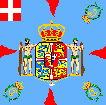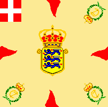 The flag was light blue with red flames and coat of arms as follows: shield parted per fess: above at dexter Or three lions passant Azure in pale surrounded by nine heartlets Gules (for Denmark),