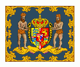 The flag was light blue with red flames and the greater state arms (pattern 1619 – 1816) with the chain of the Order of the Elephant and supported by two savages on its centre.