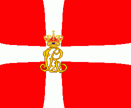 The flag is red and off-centred parted by a white cross patty. On ist centre is the royal cypher of King Christian 10, surmounted by a royal crown.