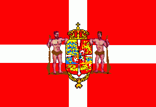 It is a Dannebrog with centred Greater Arms of Denmark supported by two savages with maces on a brown basement.