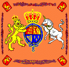 surmounted by a royal crown and supported by a crowned golden lion rampant guardant at host and a silver unicorn rampant with golden horn at fly.