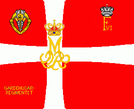 In lower hoist corner is a centred inscription in golden initials "GARDEHUSARS-" (1st line) "REGIMENTET" (2nd line).