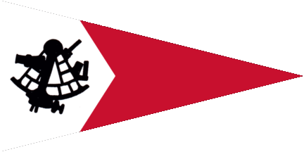 The pennant is parted per chevron pointing flyward, at hoist white with a black sextant, at fly red (see left image above), a different version has a blue fimbriation at top- and bottom edge (see right image above).