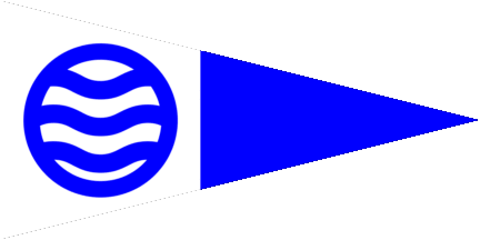 The pennant is vertically parted of white at hoist , charged with three blue waves in a blue annulet, and blue at fly with ratio of parts approximately 2:3.