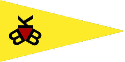 The pennant is yellow, shifted to hoist is an isosceles red triangle, bordered by black initials "BBK".