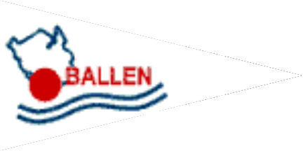 The pennant is white with a blue silhouette of Funen Island and two blue waves at bottom. The pennnant shows the location of Ballen at the south of the island, marked by a big red dot, with annexed red inscription "BALLEN".
