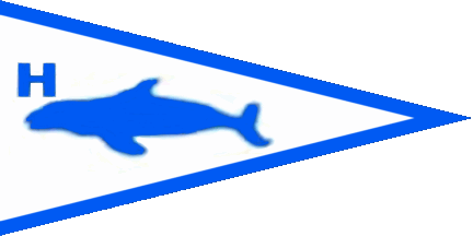The pennant is white fimbriated blue with a blue seal swimming to hoist and a blue initial "H" in canton.