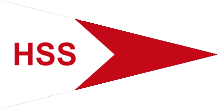 The pennant is red. Shifted to hoist is a white disc cotised blue white with blue with a white seagull fimriated blue between a blue inscription "HSB" above and blue waves below.
