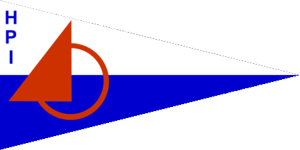 The pennant is horizontally parted of white and blue. Shifted to hoist is a red triangular sail superimposing a red annulet. Alongside the hoist on the white part is a blue inscription "HPI".