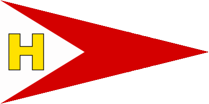 The pennant kis parted per chevron pointing to hoist of white and red. On the whte partiton is a yellow initial "H".