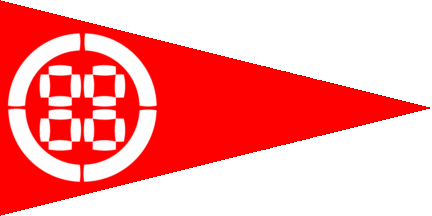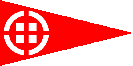 The 1st pennant (see left image above) is red, shifted to hoist are four white squares ordered 2:2, surrounded by four white nearly quarters of a white annulet.