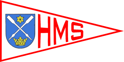 (shield Azure two oars Argent in saltire, flanked on chief by a facetted 6-point star Orand on base by a coronet Or). At fly is a converging red inscription "HMS"