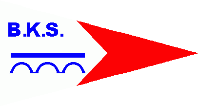 The pennant is parted per chevron shifted to fly, red at fly and at hoist white with blue inscription "B.K.S."