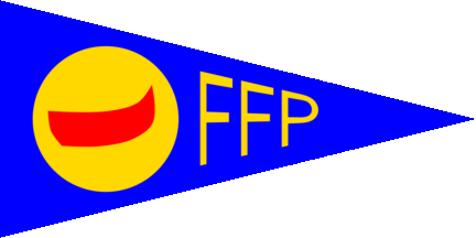 The pennant is blue. On centre is a converging yellow inscription "FFP". Shifted to hoist is a red boat on a yellow disc.