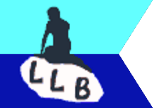 The swallow tail pennant is horizontally divided of light blue over dark blue. Over all on a white stone with black inscription "LLB" is a black kneeling woman.