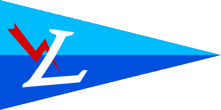 The pennant is horizontally divided of light blue over dark blue. Shifted to hoist is a white sinister bendy