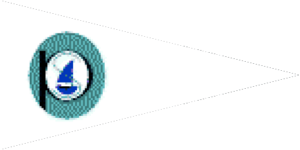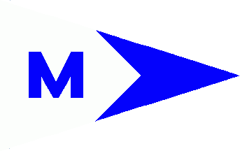 The pennant is white. Shifted to hoist in an annulat of green and blue is a blue sailing boat, superimposed by a S-shaped green rope.