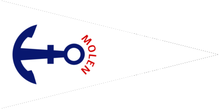 The club is based in København. The pennant is white. At hoist is a blue anchor in fess, annexed by an embowed red inscription "MOLEN" ordered vertically.