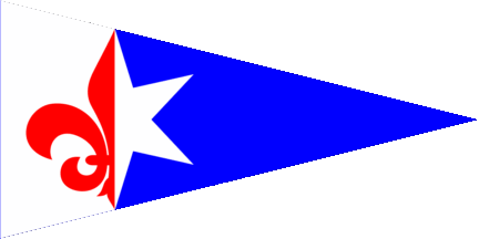 The pennant is off-centred parted per pale of white and blue. The white field is charged with ra ed fleur-de-lis couped per pale.