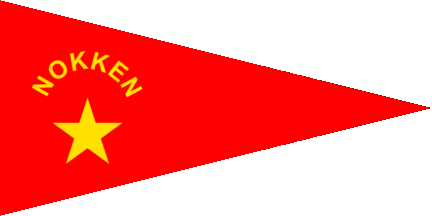 The pennant is red. Shifted to hoist is a yellow 5-point star under an embowed yellow inscription "NOKKEN". Nokken is a borough located on Western Amager Island.
