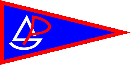 The pennant is blue fimbriated red. Shifted to hoist is a logo, a white "S" shaped like a sailing boat under a red "P" in bend sinister.