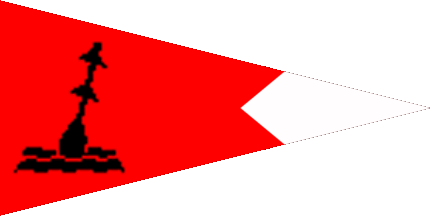 The pennant is red with a black buoy in bend on black waves. The fly is white, the line of partition is a chevron pointing to hoist.
