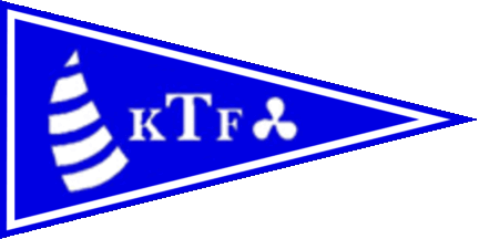 The pennant is blue cotised white-blue with white inscription "KTF" with bigger "T" between a white sail at hoist and a white ship propeller at fly.