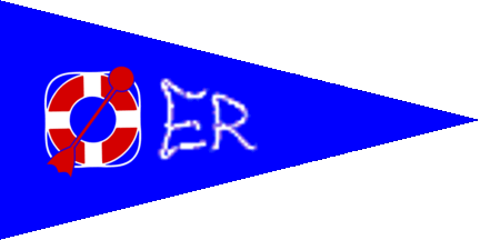 The pennant is blue. On hoist is a lifesaver of red and white with white rope and superimposed by a red buoy in bend.