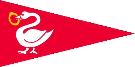 The pennant is red. Shifted to hoist is a white swan holding a yellow annulat by his beak.